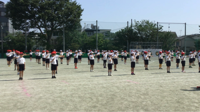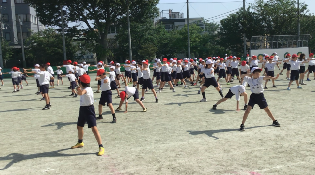 4年生の表現は、カンフーに挑戦しています。題名は、「燃えよ!東深沢少林拳!」です。「みんなで早い動きを合わせる」ということを目標に、練習に励んでいます。表現は振り付けがかなり難しく、体力も使いますが、みんなが頑張って練習していて体力がついてきています。