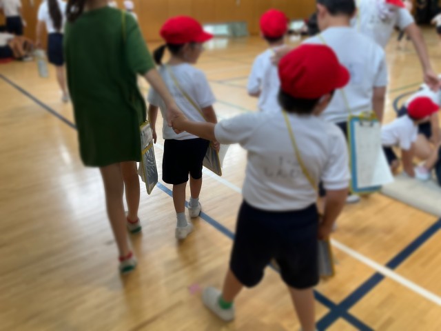 体力テスト中は6年生が1年生に「頑張れ!」「すごいね!」「いいじゃん!」と声をかけたり、手を繋いで次の場所へ連れて行ってくれたりしました。1年生は6年生と離れないように行動したり、しっかり話を聞いたりして、一生懸命取り組みました。