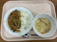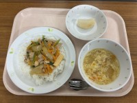 豚肉と小松菜の中華丼ひき肉あんの冬瓜スープ梨牛乳