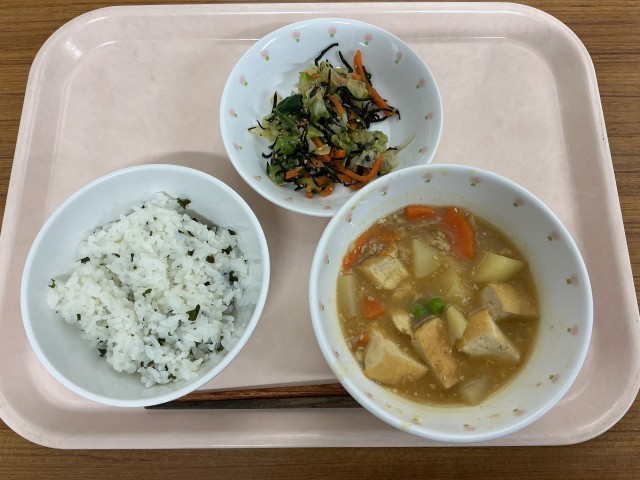 わかめごはん生揚げのそぼろ煮ひじきのごま和え牛乳