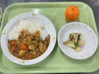 今日の給食は、カレーライス、かぶサラダ、ポンカン、牛乳です。今日のカレーライスは...