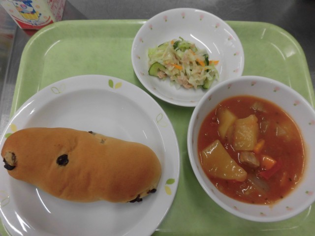 今日の給食は、ぶどうパン、トマトシチュー、ツナサラダ、牛乳です。