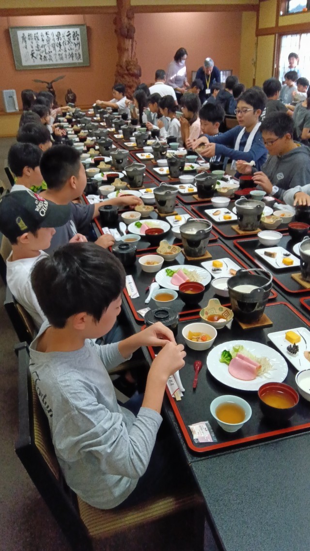 あいさつ担当の児童からは、「今日は、ハイキングなどで体をいっぱい動かすので、しっかり食べてエネルギーを蓄えましょう」という言葉がありました。
