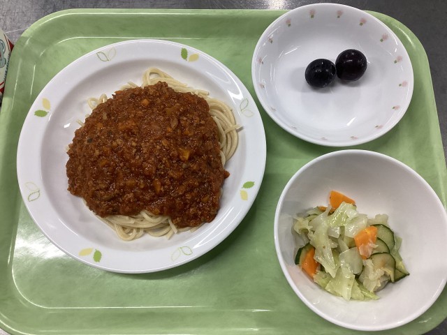 今日の給食は、スパゲティミートソース、フレンチサラダ、巨峰、牛乳です。
