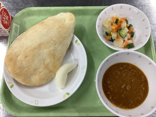 今日の給食は、ナン、キーマカレー、マセドアンサラダ、なし(豊水)、牛乳です。