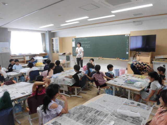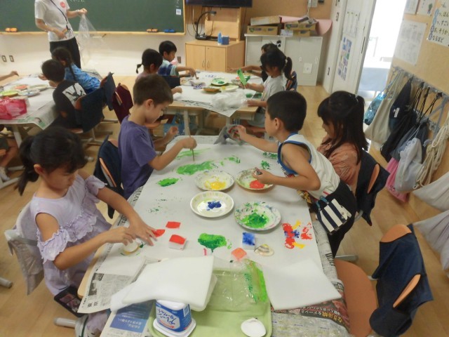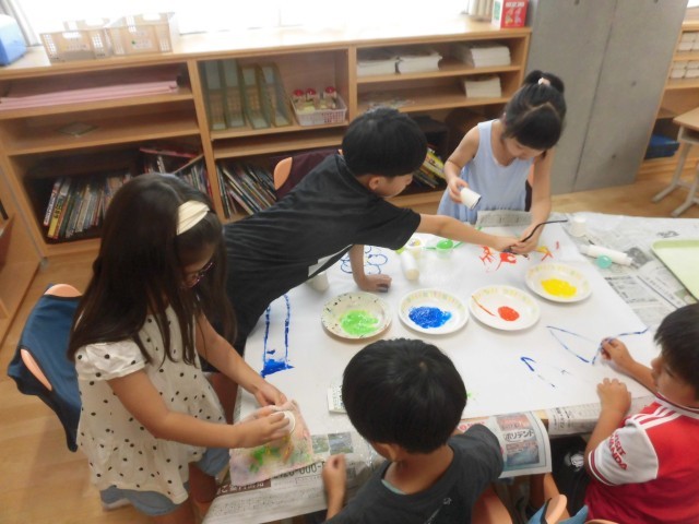 スポンジや紙コップ、毛糸などに絵の具を付けて、大きな模造紙に