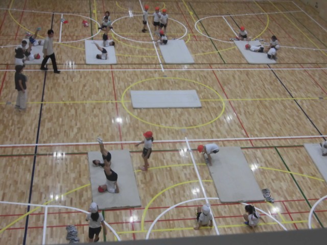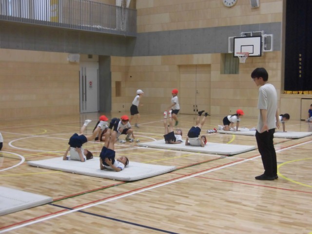 肩倒立やブリッジなどを友だちと楽しみながらやっていました。