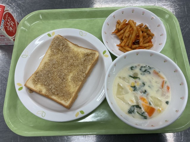 今日の給食は、セサミトースト、クリームスープ、マカロニソテー、牛乳です。