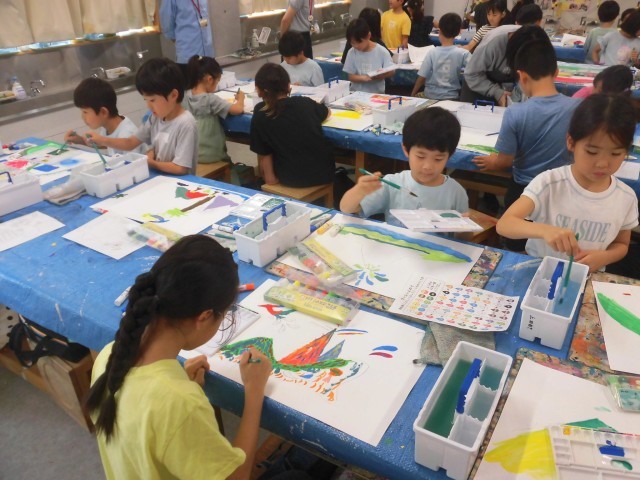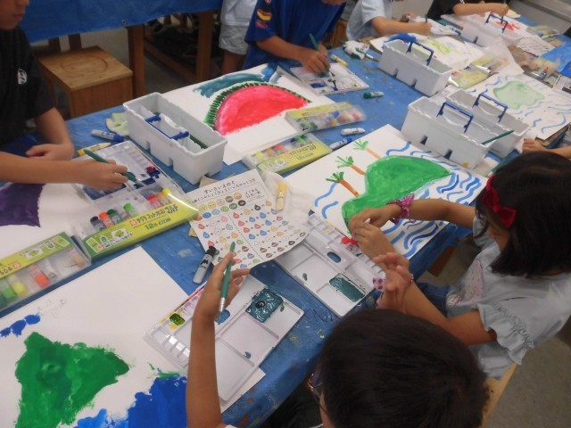 図工の先生からもらった「混色表」を参考にしながら、色を混ぜ合わせ、思い思いの島を描いていました。