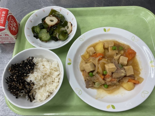 今日の給食は、七分つきごはん、あさりとひじきのふりかけ、肉じゃがうま煮、きゅうりとわかめの酢の物、牛乳です。