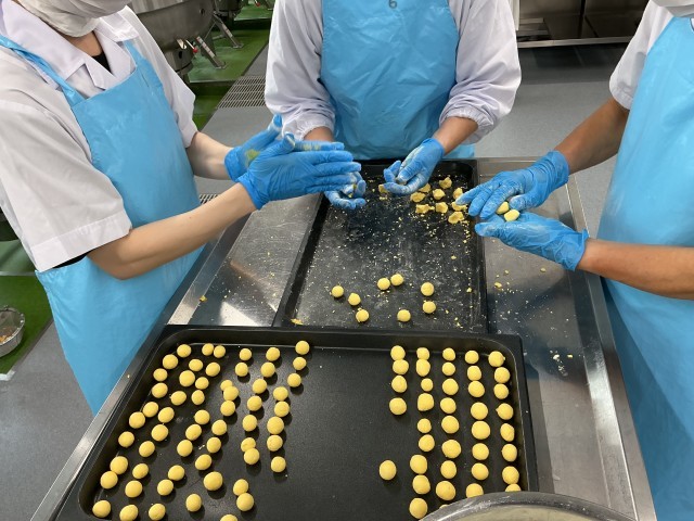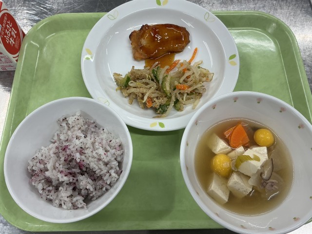 今日の給食は、ゆかりごはん、照り焼きチキン、もやしのごま酢和え、月見団子汁、牛乳です。今日は十五夜です。かぼちゃで色付けしたお団子を作り、汁の中に入れました。