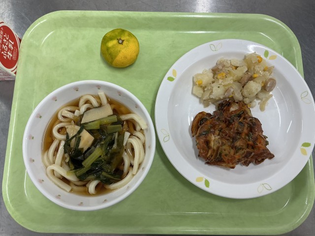 今日の給食は、かき揚げうどん、ジャーマンポテト、みかん、牛乳です。