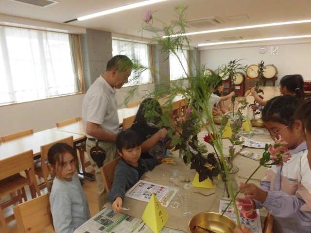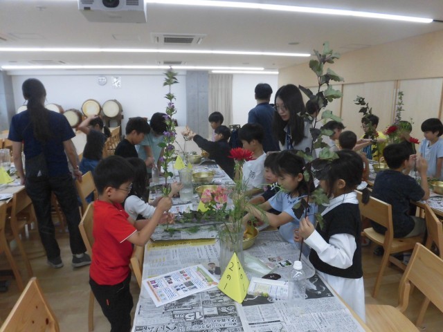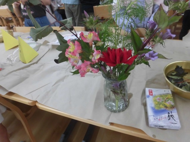 花の色や茎の長さなど、全体のバランスを考えながら、花瓶に花を生けていました。