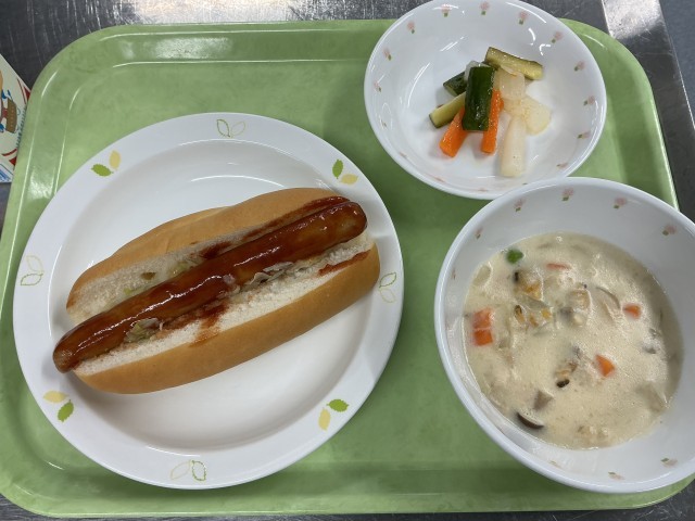 今日の給食は、ホットドック、クラムチャウダー、ピクルス、牛乳です。
