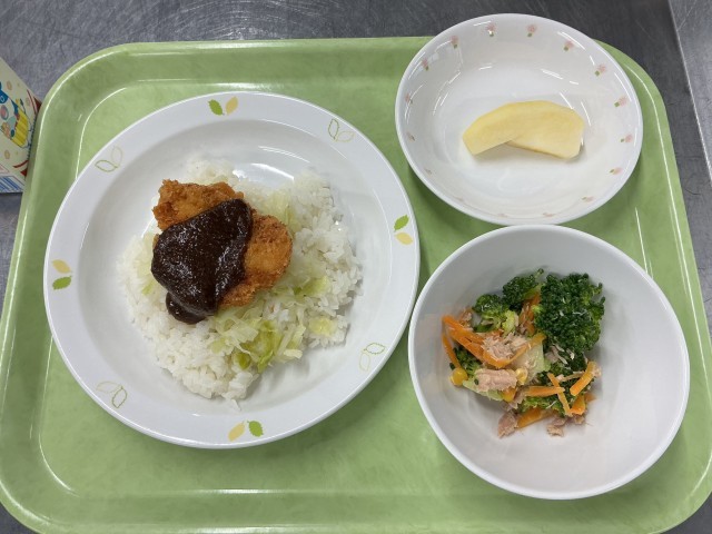 今日の給食は、チキンみそカツ丼、ブロッコリーとツナのサラダ、りんご、牛乳です。運動会応援献立になっています。