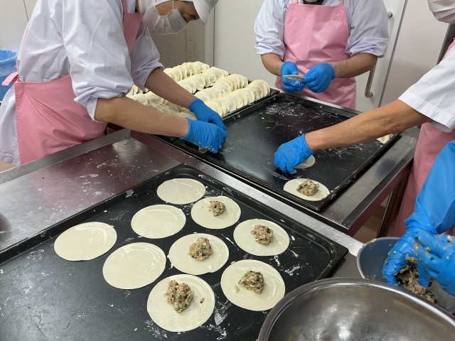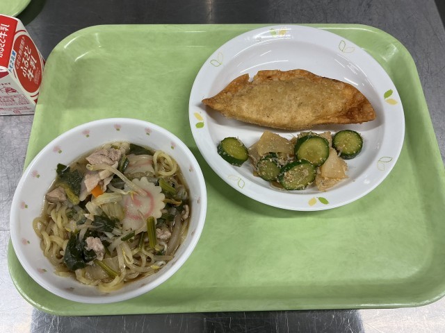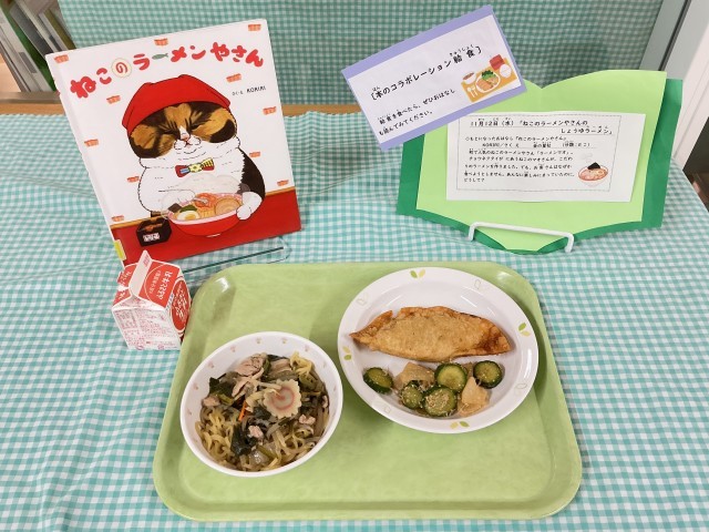 今日の給食は、ねこのラーメンやさんのしょうゆラーメン、ジャンボぎょうざ、じゃこと大根のサラダ、牛乳です。本のコラボレーション給食3日目です。今日のラーメンスープは、絵本と同じく煮干し、昆布、かつお節でおだしをとりました。