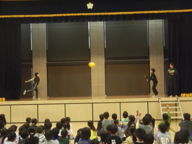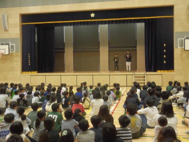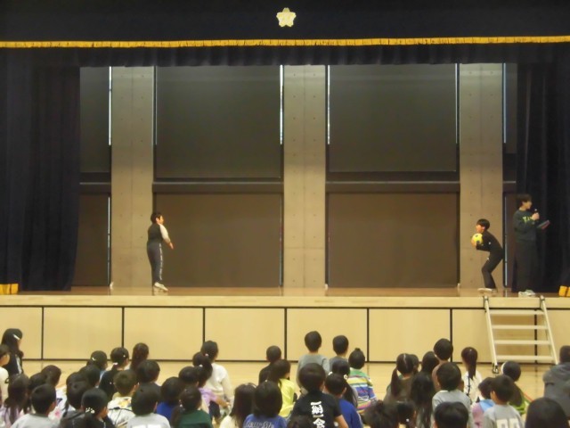 集会委員会の担当児童が舞台の上で学校生活にちなんだ演技を2回行い、