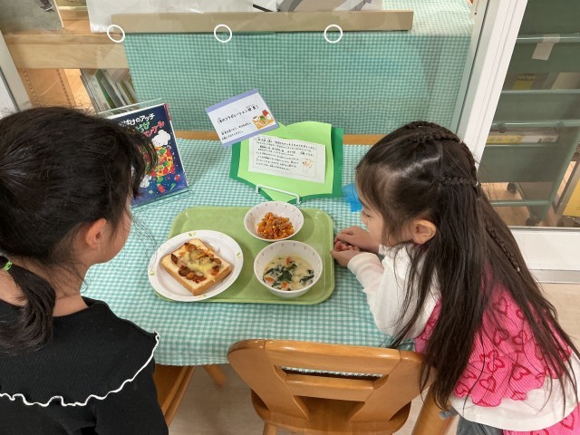 今日の給食は、おばけのアッチうちゅうピザトースト、クリームスープ、にんじんサラダ、牛乳です。今日は、おばけのアッチくるくるピザコンクールという本のピザをイメージしています。本と同じくブロッコリーをピザの具に使いました。