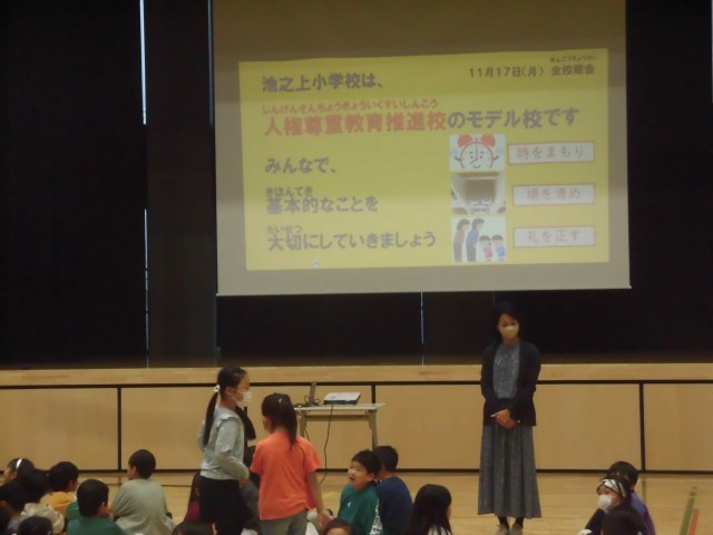 本校は、人権尊重教育推進校ということもあり、全校朝会では毎回、人権や「人を大切にする」といったことについて