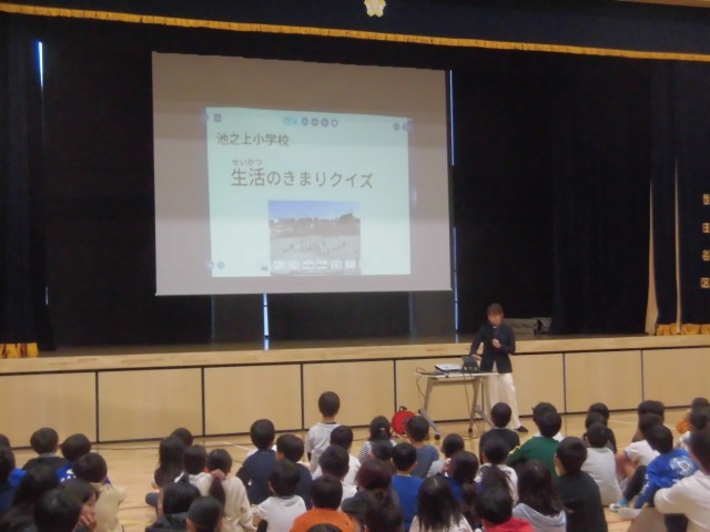 今日は他にも、生活指導からは11月の生活目標「廊下や階段の右側を静かに歩きましょう」の話、代表委員会からは「マツノッキーフェスティバルのスローガン発表」、