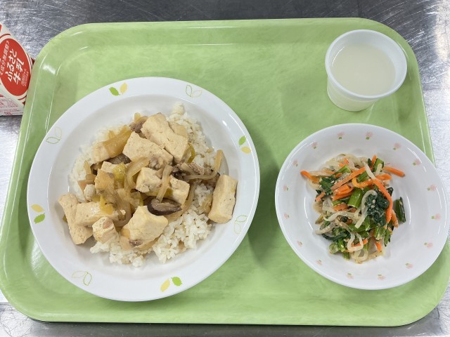 今日の給食は、豚きのこ丼、野菜のごまあえ、ホワイトゼリー、牛乳です。