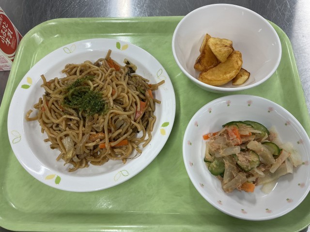 今日の給食は、ソース焼きそば、フライドポテト、ツナと大根のサラダ、牛乳です。