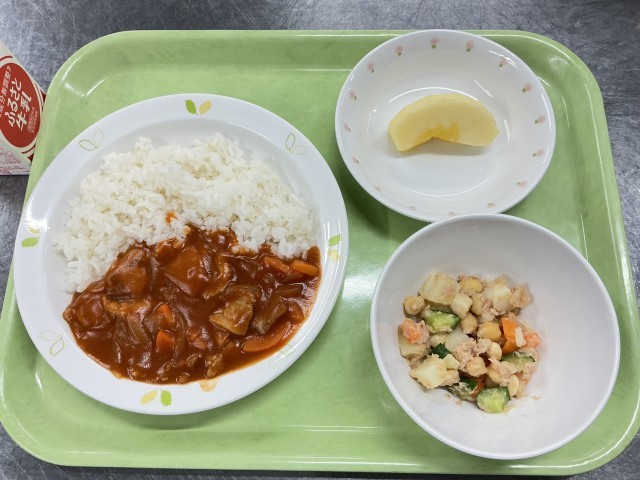 今日の給食は、ハッシュドポークライス、ビーンズサラダ、りんご(サンフジ)、牛乳です。