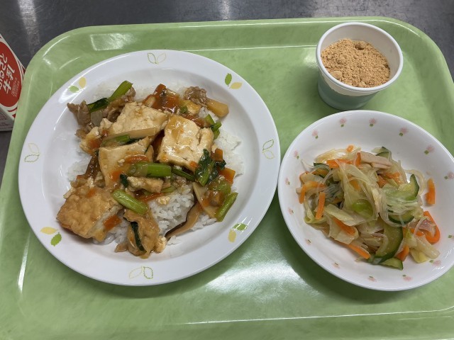 今日の給食は、家常豆腐丼、春雨サラダ、黒蜜寒天、牛乳です。
