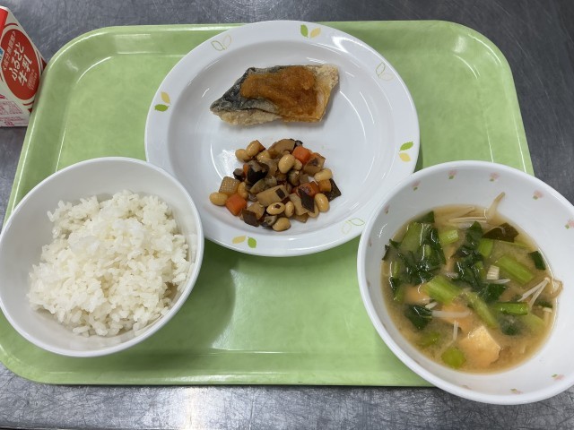 今日の給食は、有機米ごはん、さばのおろしあんかけ、五目豆、生揚げともやしの味噌汁、牛乳です。