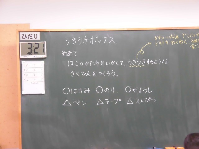 めあては、「はこのかたちを生かして、うきうきするような作品を作ろう。」です。