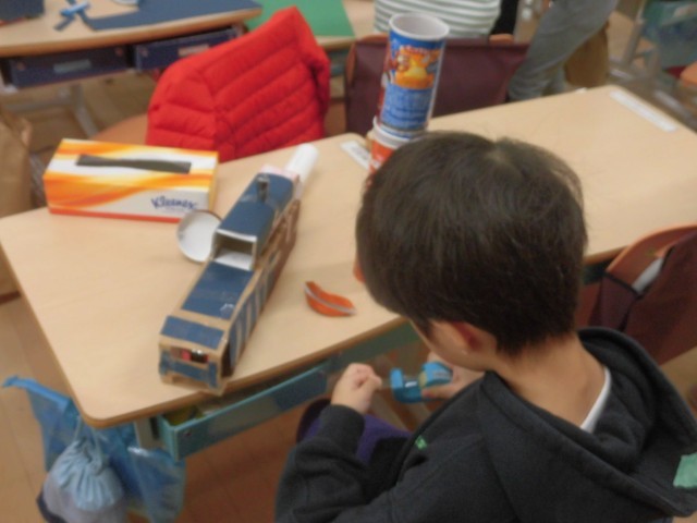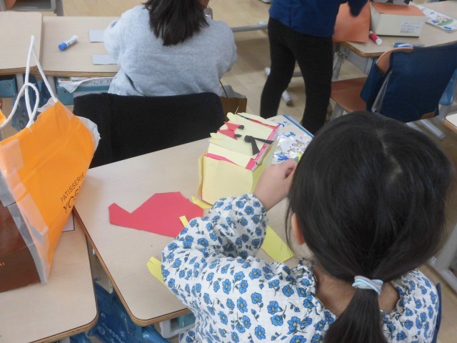 子ども達は、持ってきた箱を重ねたりつなげたりしながら、想像を膨らませ、とても素敵な作品に仕上げていました。