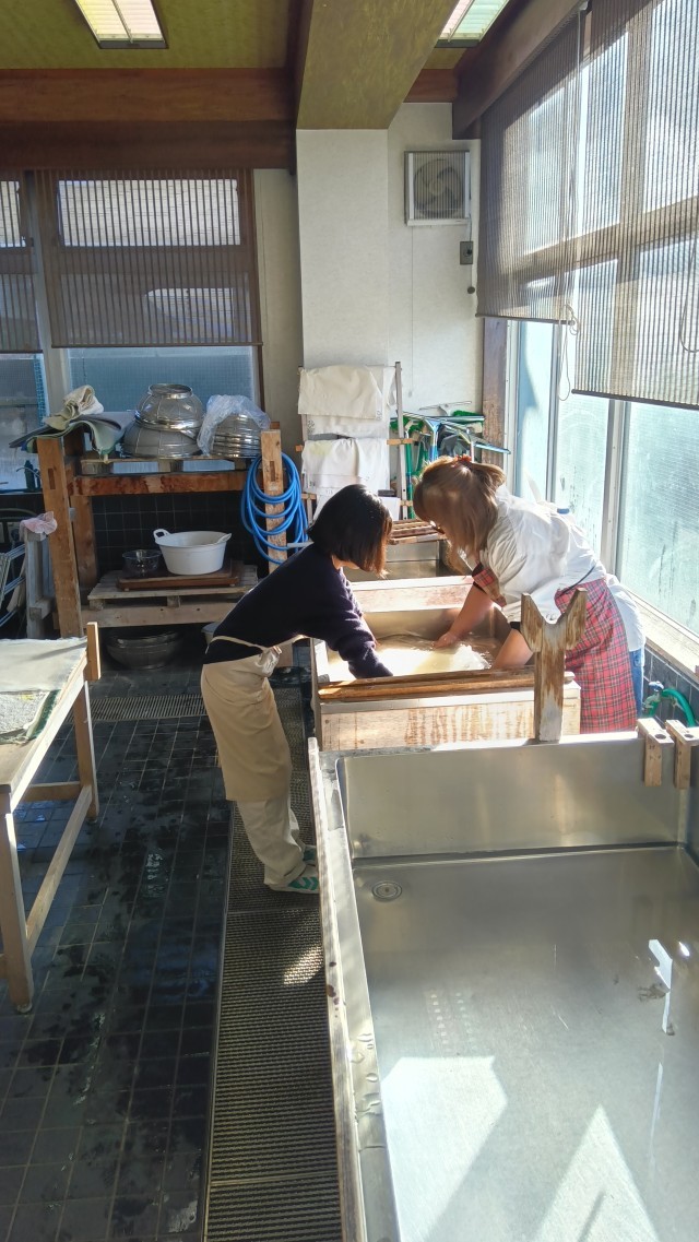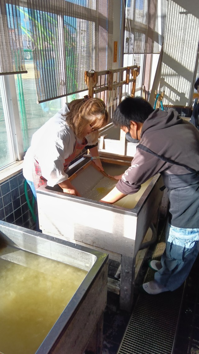 ここで、自分自身の卒業証書用の和紙を作成させていただきます。一生残る大事な紙ということもあって、みんな慎重に紙漉きを行っていました。