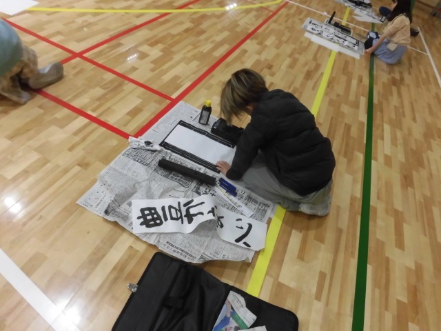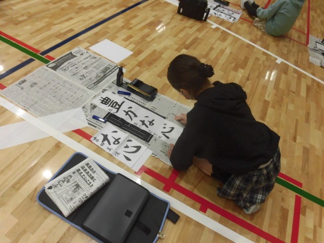 5年生が体育館で、新年の書初め会に向け毛筆の練習をしていました。