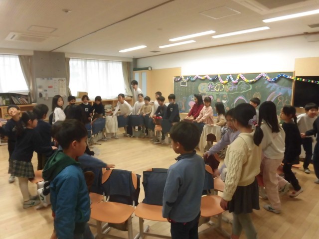 その後、しばらくしてから改めてのぞいてみると、椅子取りゲームの最中でした。