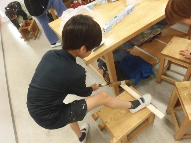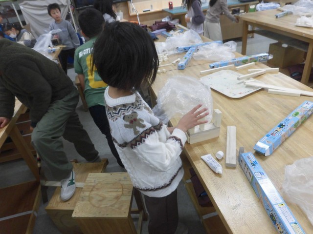木の棒をのこぎりでいろいろな長さに切り取って、立体作品を作るようです。