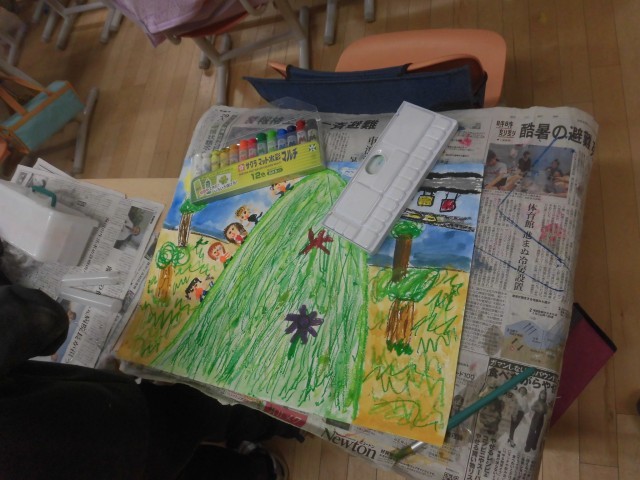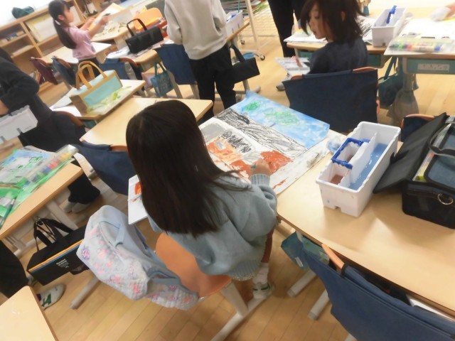1年生の教室へ行くと、図工の授業で絵を描いていました。