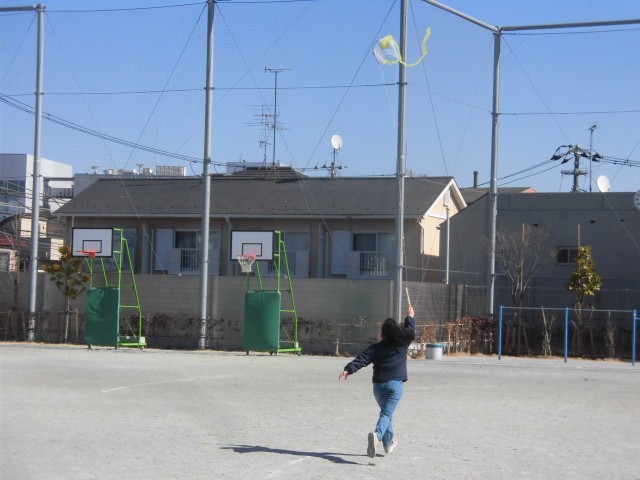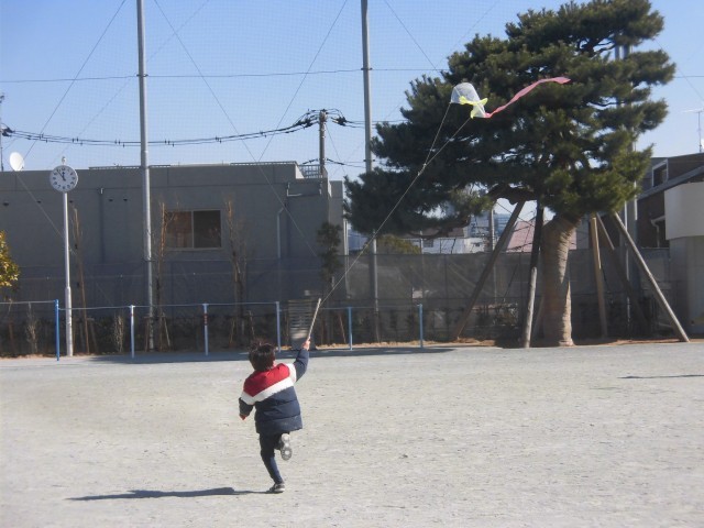 にじいろ学級の低学年の子達が、校庭で凧あげをしていました。