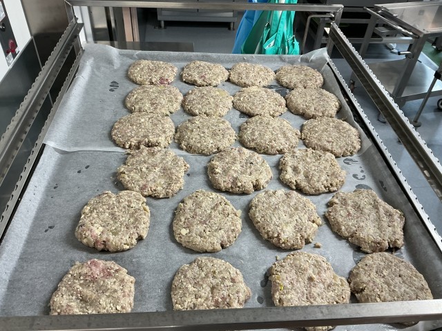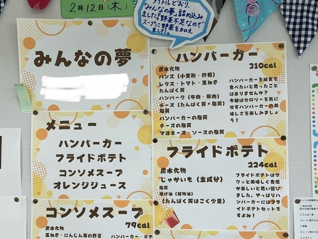 今日の給食は、ハンバーガー、青のりフライドポテト、コンソメスープ、牛乳です。今日の献立は6年2組3班が考えた献立です。