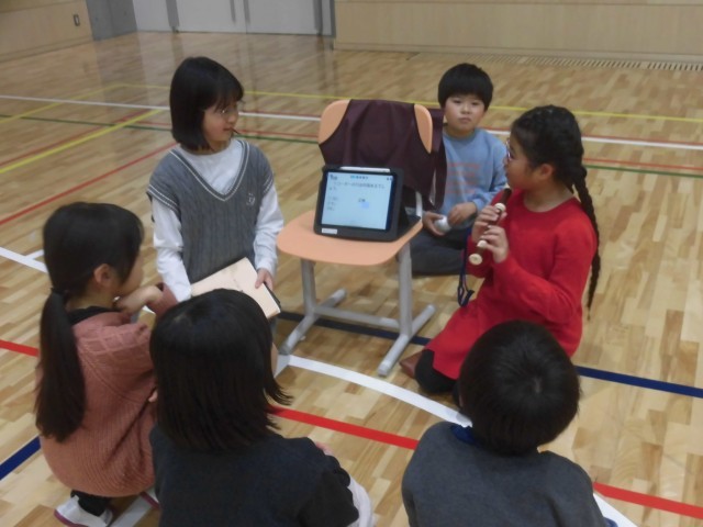 タブレットで社会科見学の様子が分かる画像を見せながら説明したり、3年生の音楽から使用するリコーダーの
