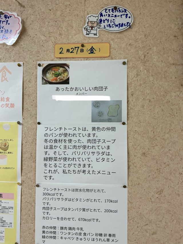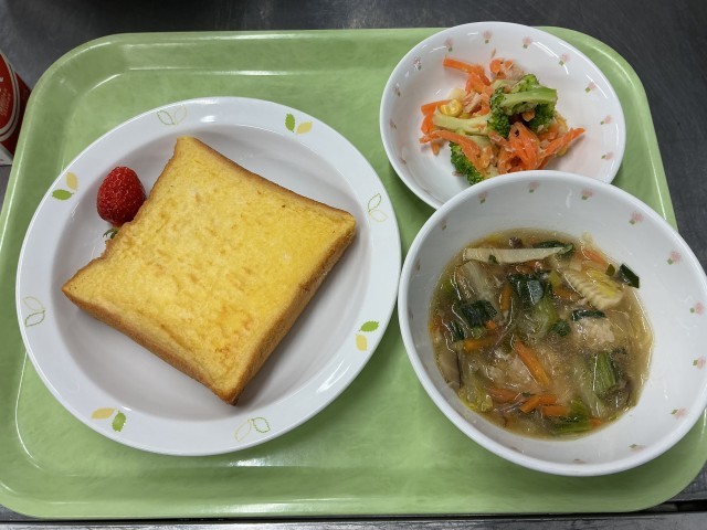 今日の給食は、フレンチトースト、肉団子入り春雨スープ、ブロッコリーの味噌ドレッシングサラダ、いちご(紅つやか)、牛乳です。今日は、6年1組2班が考えた献立です。
