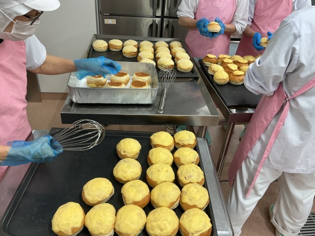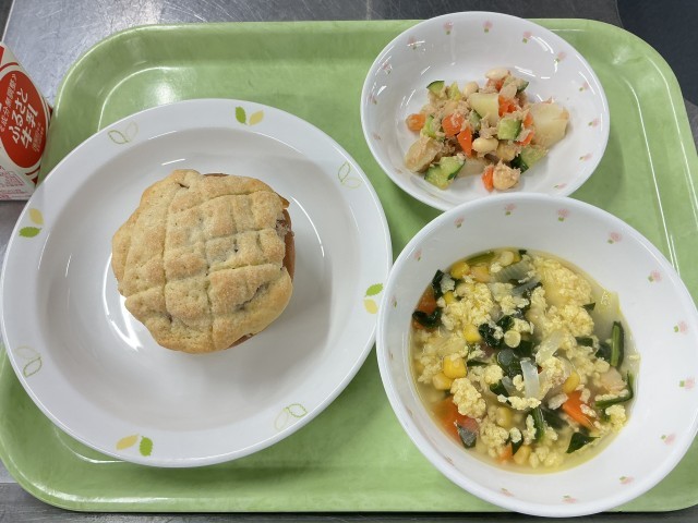 今日の給食は、手作りメロンパン、卵とチーズのふわふわスープ、ビーンズサラダ、牛乳です。