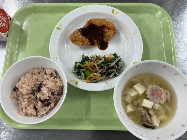 今日の給食は、赤飯、ヒレカツ、小松菜のおひたし、春の祝い汁、牛乳です。今年度最後の給食です。保護者の皆様、一年間学校給食にご理解・ご協力いただきありがとうございました。