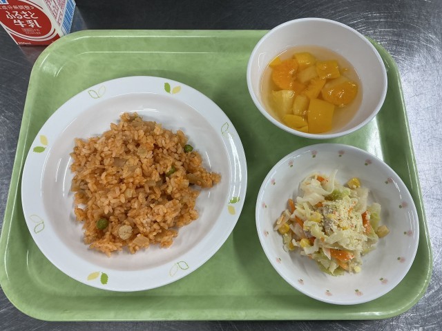 今日の給食は「チキンライス、シーザースサラダ、フルーツポンチ」です。