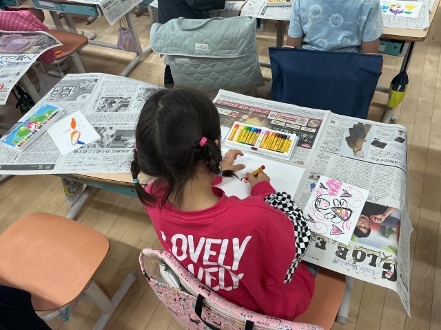 「すきなものいっぱい」という単元で、クレパスを使って画用紙に好きな絵を描いています。