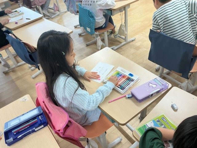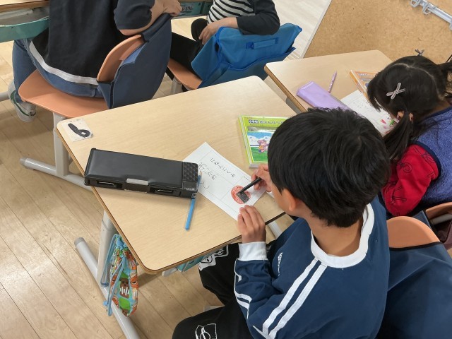 2年生の教室に行くと、カードにとても丁寧に名前やイラストをかいていました。