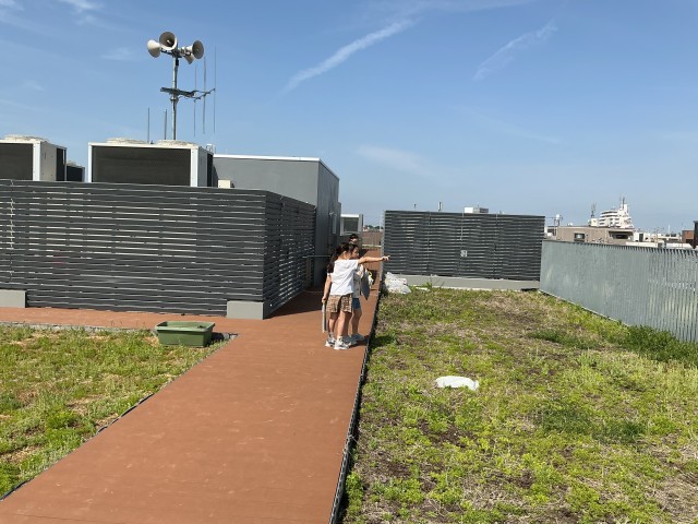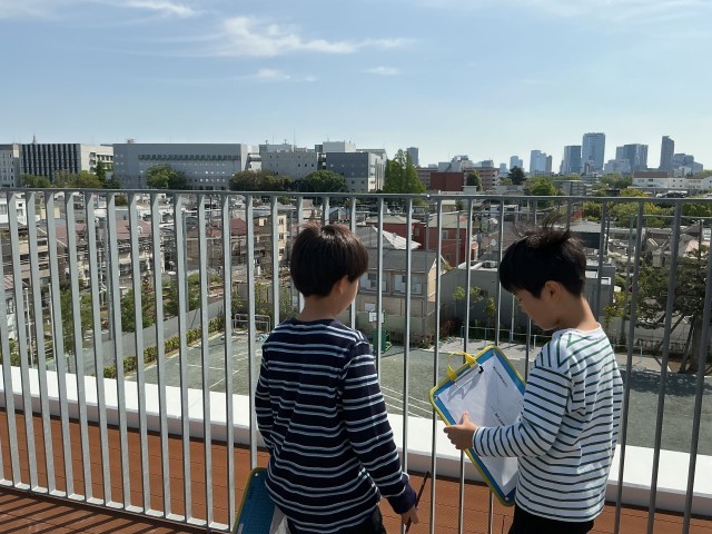 学校のまわりには何があるか、屋上から調べています。
