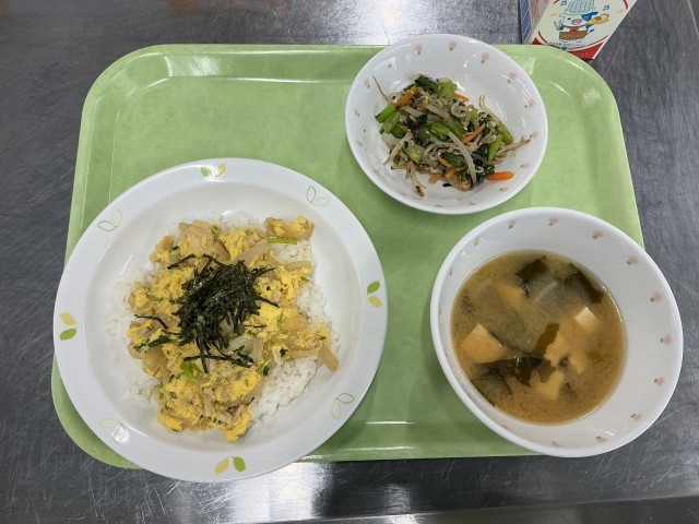 今日の給食は「親子丼、野菜の乾物あえ、生揚げと大根のみそ汁」です。