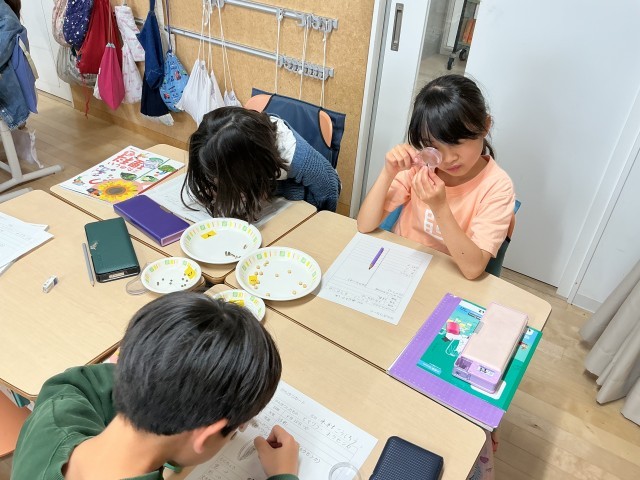 虫眼鏡なども使って、じっくりと種を観察し、カードにまとめることができていました。