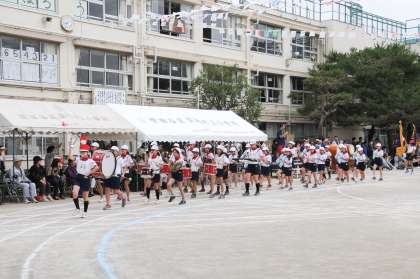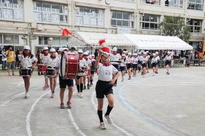 【入場・はじめの運動】鼓笛係の演奏で運動会が始まります。鼓笛係は、この日のために練習を積んできました。はじめの運動は昨年から新しい体操となりました。リズムに合わせて、心と体の準備をしました。