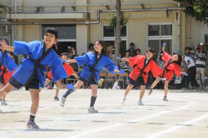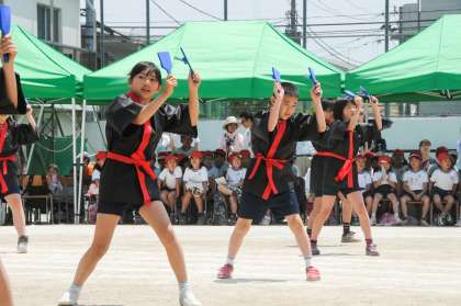 よさこいソーラン祭りで使われた曲「よっちょれ」でニシン漁やお祭りの様子を表現します。鳴子を生かした動きや、「ソーラン!ソーラン!」「はっ!」「よいしょ!」など、元気な掛け声をがんばって練習してきました。